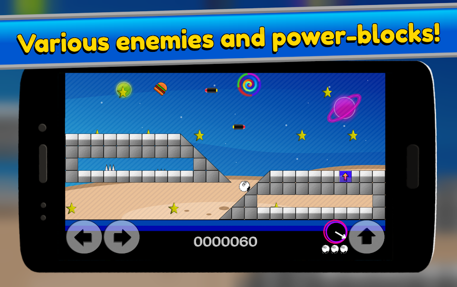 Sepanjang jalan ada banyak hal untuk membantu Anda (power-up Bricks, seperti 'Super-Jump' & Blok Transporter), serta berbagai musuh untuk menghambat kemajuan Anda.